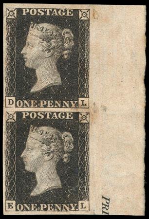 Great Britain, 1840, Queen Victoria First Issue, 1d black. O.g., bits of hinge remnant, plate 6 with part imprint at right; thin on "L" square and top of EL also with central thin, scissor cut at "D" square, Very Fine appearance, an affordable example of this classic, with 2025 Brandon certificate. SG No. 2. Scott No. 1; $25,000 as singles. US$0 (Image)