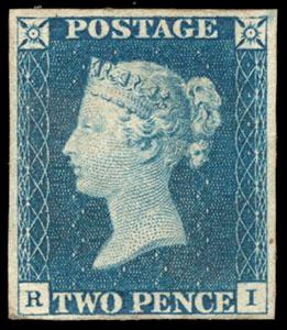 Great Britain, 1840, Queen Victoria First Issue, 2d blue. Small part o.g., margins mostly full to clear at bottom left, bold color, F.-V.F., an attractive example of this very rare unused first issue. SG No. 5. Scott No. 2; $38,000.