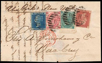 Great Britain, 1865, Queen Victoria, 1s green, Emblems watermark. In combination with 1858-65, 1d rose red + 2d deep blue + 3d rose (33, 29, 44) on folded letter to Vera Cruz, Mexico, tied by barred oval handstamps with red "Lombard Street, Paid, AP 25, 65" cds, Very Fine, an attractive four color franking usage to Mexico. Scott No. 48; Estimate $200 - 300. US$200-300 (Image)