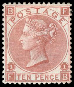 Great Britain, 1867, Queen Victoria, 10d red brown, Spray of Rose watermark. Plate 1, lettered FB, o.g., strong bright color and particularly fresh, Fine, a lovely example of this scarce mint high value, with 1983 E. Diena certificate. SG No. 112. Scott No. 53; $3,500. US$0 (Image)