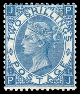 Great Britain, 1867, Queen Victoria, 2s dull blue, Spray of Rose watermark. Plate 1, lettered PJ, o.g., bright and fresh with bold color, Fine. SG No. 118. Scott No. 55; $3,750. US$0 (Image)