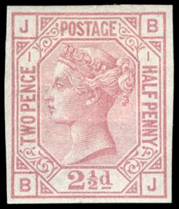 Great Britain, 1875, Queen Victoria, 2½d rosy mauve on white paper, Anchor watermark, imprimatur. Plate I, Lettered B-J, o.g., four large margins, fresh & Extremely Fine, a very rare item. SG No. 139 var. Scott No. 66 var.; Estimate $150 - 200. US$150-200 (Image)