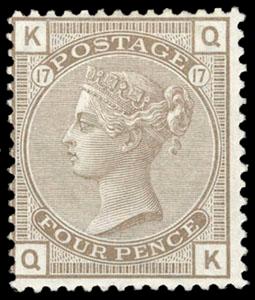 Great Britain, 1880, Queen Victoria, 4d gray brown, Large Garter watermark. Plate 17, lettered QK, o.g., strong vibrant color, fresh and Fine, with 1984 R.P.S.L. certificate. SG No. 154. Scott No. 71; $2,750. US$0 (Image)
