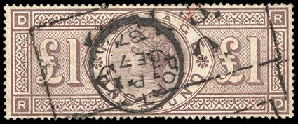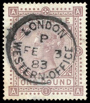 Great Britain, 1878, Queen Victoria, £1 brown lilac, Maltese Cross watermark. With bold "London Western Office Fe 3, 83" cds, rich color, bold impression and well centered, Very Fine and choice, a rare stamp this nice. SG No. 129 £4,000 ($5,320). Scott No. 75; $3,750. US$0 (Image)