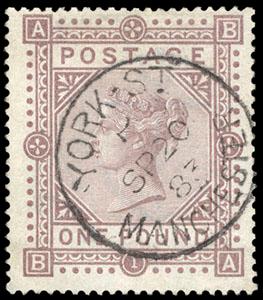 Great Britain, 1882, Queen Victoria, £1 brown lilac on white paper, Anchor watermark. Bold "York St Manchester Sep 20, 83" cds, rich color, Very Fine, a rare stamp with good eye appeal, with 1989 R.P.S.L. certificate. SG No. 136 £6,500 ($8,640). Scott No. 92a; $8,000. US$0 (Image)