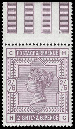 Great Britain, 1883, Queen Victoria, 2s6d lilac on white paper, Anchor watermark. Lettered CH, o.g., never hinged, gum crease in selvage only, well centered, strong bold color on bright fresh paper, Very Fine and choice, a scarce never hinged high value. SG No. 178. Scott No. 96; $625 for hinged. US$0 (Image)
