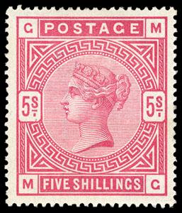 Great Britain, 1884, Queen Victoria, 5s rose on white paper, Anchor watermark. Lettered MG, o.g., well centered, fresh with bold color, Very Fine and choice, signed H. Bloch, with 1982 Friedl certificate. SG No. 180. Scott No. 108; $1,100. US$0 (Image)