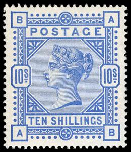 Great Britain, 1884, Queen Victoria, 10s ultramarine on white paper, Anchor watermark. Lettered AB, o.g., never hinged (slightly gum crease at left), exceptional centering amid beautifully balanced margins, bright color land very fresh, Extremely Fine. SG No. 183. Scott No. 109; $2,250 for hinged. US$0 (Image)