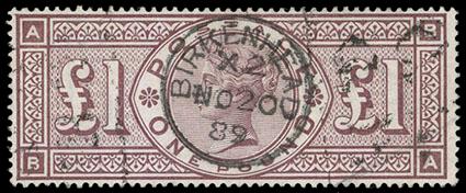 Great Britain, 1888, Queen Victoria, £1 brown lilac, Orbs watermark. With bold "Birkenhead No 2, 00" cds, rich color, Very Fine, a scarce stamp. SG No. 186 £3,500 ($4,660). Scott No. 123; $5,250. US$0 (Image)