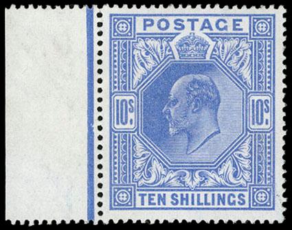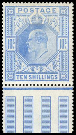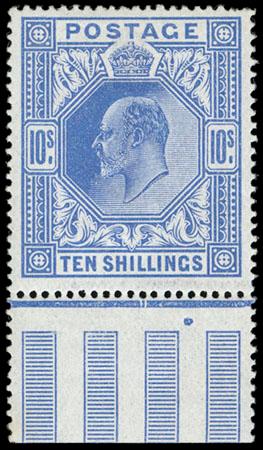 Great Britain, 1902, King Edward VII, De La Rue printing, 2s6d-10s. 3 values, bottom margin singles, o.g., 2s6d & 5s never hinged, 10s lightly hinged, rich colors, 2s6d with central vertical bend, otherwise Very Fine. SG No. 260/265. Scott No. 139-141; $2,050. US$0 (Image)