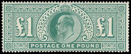 Great Britain, 1902, King Edward VII, De La Rue printing, £1 dull blue green. O.g., never hinged, deep rich color, Very Fine, a scarce stamp never hinged. SG No. 266 £2,500 ($3,320). Scott No. 142; $3,450. US$0 (Image)