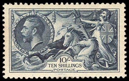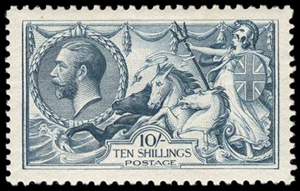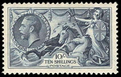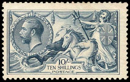 Great Britain, 1919, King George V "Seahorse", Bradbury, Wilkinson printing, 10s steel blue. O.g., small h.r., bright color, Fine and a scarce shade. S.G. Spec. No. N71(3) £1,100 ($1,460). Scott No. 181 var.; Estimate $100 - 150. US$100-150 (Image)