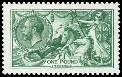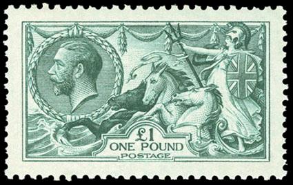 Great Britain, 1913, King George V "Seahorse", Waterlow printing, £1 green. O.g., small hinge remnant, well centered with rich color and bold impression, Extremely Fine, a scarce beautiful stamp. SG No. 403 £3,750 ($4,990). Scott No. 176; $3,000. US$0 (Image)