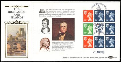 Great Britain, 1989, Scotland Regional Machin Head booklet pane "imperforate". Neatly tied on First Day Cover with Ayr Philatelic Counter cds; attractive Benham silk cachet at left, also enclosed is a letter from the original sellers of this cover attesting to it's authenticity and rarity, Extremely Fine, a very rare error, believed to be unique on cover. Scott No. SMH45a var; Estimate $400 - 600. US$400-600 (Image)