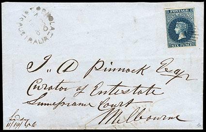 South Australia, 1855, Queen Victoria (London Print), 6d deep blue, imperf. Large Star watermark. Four large margins with portion of two adjacent stamps, tied on folded letter with grid cancel, "Penola, No 20, 1856" cds at left addressed to Melbourne, the six pence rate payed the postage to other Australian States to 1 ounce, Extremely Fine and attractive. SG No. 3. Scott No. 3; Estimate $2,000 - 3,000.