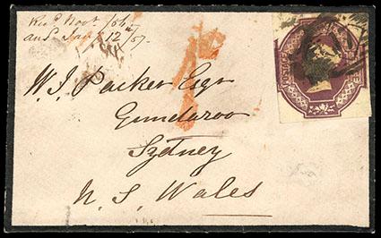 Great Britain, 1854, Queen Victoria (embossed), 6d purple. Square cut with portions of adjacent stamps at top and left, tied on 1858 mourning cover from London to Sydney, New South Wales with barred numeral "17" in diamond (London district) cancel, backstamped with "Ship Letter Sydney No 10, 1858" oval datestamp, Very Fine, scarce. SG No. 60. Scott No. 7; Estimate $400 - 600. US$400-600 (Image)