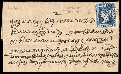 India, 1854, Queen Victoria Lithographed, ½a blue. With four margins, tied on 1855 native folded letter to Mannargoody with diamond of dots, backstamped with red oval "Mannargoody 20 3,55" datestamp with manuscript date, Very Fine,ex-Provera, signed A. Diena. SG No. 2 var. Scott No. 2; Estimate $1,000 - 1,500. US$1,000-1,500 (Image)