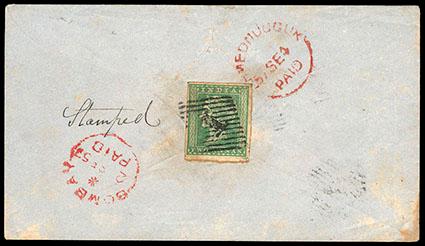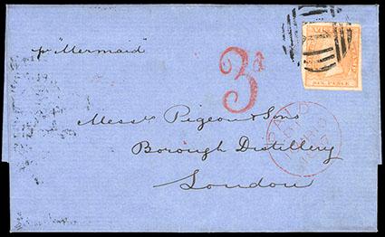 AN EXCEPTIONAL COVER BELIEVED TO BE THE EARLIEST USAGE OF THE 1854 2 SHILLING WOODBLOCK ISSUE. US$2,000-3,000 (Image)