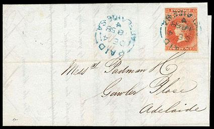 South Australia, 1857, Queen Victoria (Local Print), 2d red, imperf. Large Star watermark. Four even margins and rich color, tied to folded letter by blue "Adelaide, Paid, De 4 1858" origin cds, with second strike alongside, 2d adhesive paid the inland letter rate to ½ ounce, Extremely Fine and choice. SG No. 9. Scott No. 7; Estimate $300 - 400. US$300-400 (Image)