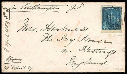 Mauritius, 1859, "Britannia", 6d blue, bottom margin single. Four large margins with rich color, tied by grid on cover to Hastings, England, manuscript "via Southampton" routing endorsement, backstamped with "Packet Letter, Mauritius, Ap 14, 1859" oval datestamp and Hastings receiving mark, Extremely Fine. SG No. 32. Scott No. 18; Estimate $500 - 750. US$500-750 (Image)