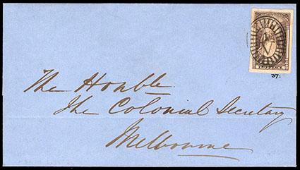 Victoria, 1852, Queen Victoria ("Queen on Throne"), Ham printing, 2d purple brown. Position 37. Beautiful four margined single with rich color, tied to 1853 cover by barred oval "V1" handstamp paying the drop letter rate, backstamped "Melbourne, Ma 2, 1853" oval crown datestamp, Extremely Fine,ex-C. Pack. SG No. 18b. Scott No. 14b; Estimate $300 - 400.
