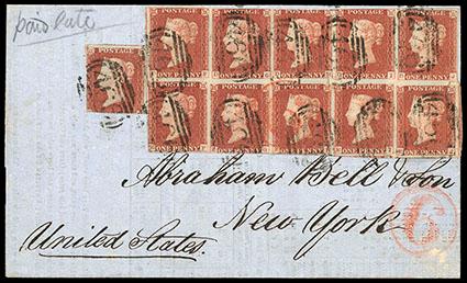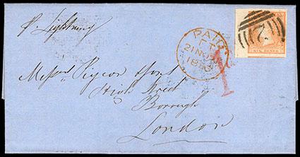 A STUNNING ON COVER EXAMPLE OF THE 1852 1D CARMINE ON BLUISH PAPER WITH THE "WALE" FOR "WALES" PLATE VARIETY. US$3,000-4,000 (Image)
