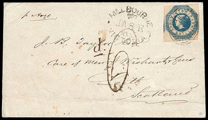 Victoria, 1854, Queen Victoria ("Cameo"), 1s blue. Four large margins with portion of three adjacent stamps, tied on 1855 cover to Leith, Scotland with oval "V1" cancel, "Melbourne, Ja 8, 1855" Crown oval datestamp at left, manuscript "per Argo" ship endorsement, manuscript "d .6" rating, with Edinburgh and London transit backstamps, Extremely Fine and choice. SG No. 25. Scott No. 18; Estimate $500 - 750. US$500-750 (Image)