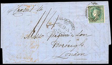 Victoria, 1854, Queen Victoria ("Wood Block"), 2s dull bluish green on pale yellow. With four margins tied to 1854 folded letter from Melbourne to London, England, tied with oval "V1" cancel, matching "Melbourne, Se 9, 1854" oval Crown datestamp alongside, "p Croesus Str " ship endorsement, manuscript "1/4" rating to pay on arrival (double the 8d ship fee), Extremely Fine and choice,ex-Charles Jewell & R.S. Wilkins. SG No. 35. Scott No. 19; Estimate $2,000 - 3,000.