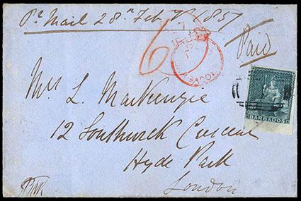 Barbados, 1855, "Britannia" (1d) deep blue, imperf. Four large margins including sheet margin at bottom, tied on 1857 cover to London, England with barred numeral "1" handstamp, endorsed "pr. Mail 28th Feb 7, 1857" at top, "6" rate mark in red crayon, "Paid at Barbados" crown circle handstamp and London receiving cds both in red on front, backstamped "Barbadoes Fe, 28, 1857" cds, Extremely Fine. SG No. 10. Scott No. 6; Estimate $300 - 400. US$300-400 (Image)
