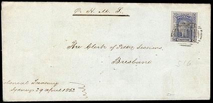 New South Wales, 1851, Queen Victoria, 2d ultramarine, plate I, yellowish paper. Four large margins, tied to 1858 O.H.M.S. letter sheet by barred oval cancel, addressed to Brisbane, backstamped with "Sydney, New South Wales, Ap 29, 1858" cds, Extremely Fine, scarce early cover going to the Moreton Bay District, Queensland, ex-Col. George Walcott Esq. SG No. 51. Scott No. 11; Estimate $200 - 300. US$200-300 (Image)