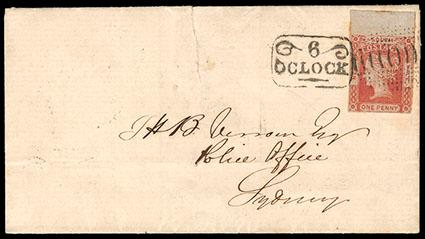 New South Wales, 1852, Queen Victoria, 1d carmine, bluish paper, "WALE" plate variety. Position 9. Top margin single, locally used on 1852 folded letter sheet to the Police Office in Sydney, tied by barred oval grid and framed "6 O Clock" handstamps, reverse with "Sydney, New South Wales, De 18, 1852" receiving cds; cover with sealed tear at top center, Extremely Fine,ex-A. Lichtenstein & Louise Dale. SG No. 48c. Scott No. 13f; Estimate $3,000 - 4,000.
