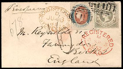 New South Wales, 1854, Queen Victoria, 6d gray. Watermarked "6". Additionally franked with Registration 1856, 6d orange & blue (F1), both stamps with large margins and tied to small 1857 cover to Harrington, England by barred oval cancels, oval "Registered, Sydney, N.S.W., Ju 18, 1857" date stamp and registered G.P.O transit marking from London both in red, back stamped with Harrington receiving mark, Extremely Fine. SG No. 94, 105. Scott No. 29; Estimate $1,500 - 2,000.