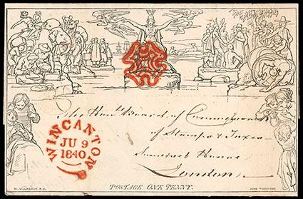 Great Britain, 1840, Mulready Letter Sheet, 1d black, Ordering 1d & 2d "Labels". Stereo A 50 from Wincanton to London; canceled with superb red Maltese Cross and matching "Wincanton Ju 9, 1840" cds, backstamped with "G Ju 10 1840" receiving datestamp of London, addressed to "The Honbe Board of Commissioners of Stamps & Taxes, Somerset House, London" and written "Gentm, Please forward me 10 Sheets Penny Labels, 2 Sheets Two Penny", Extremely Fine and choice, very rare this nice. Scott No. U3; Estimate $1,500 - 2,000.