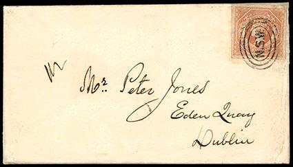 New South Wales, 1854, Queen Victoria, 1s brownish red. Watermarked "12". Four margined single (small corner defect) tied to 1859 cover to Ireland with "N.S.W." in three concentric oval handstamp, backstamped "Sydney, Au 5, 1859" cds and "Dublin, Oc 15, 1859" receiving mark, Very Fine and attractive, with 2018 B.P.A. certificate. SG No. 101. Scott No. 31; Estimate $200 - 300. US$200-300 (Image)