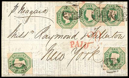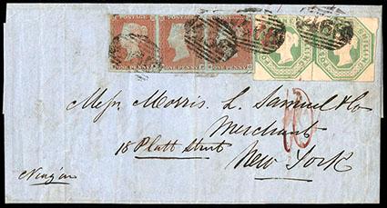 Great Britain, 1847, Queen Victoria (embossed), 1s pale green. Two singles in combination with 1841, 1d red brown (3, vert. file fold affecting one stamp), strip of three with four margins, tied on 1849 cover from Liverpool to New York with barred numeral "466"; endorsed "Niagara" at lower left, backstamped "Liverpool Mr 24, 1849" origin cds and docketing acknowledging receipt on "Apr 17, 1849", Extremely Fine, a scarce and appealing cover. SG No. 54. Scott No. 5; Estimate $300 - 400. US$300-400 (Image)
