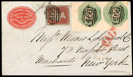 Great Britain, 1847, Queen Victoria (embossed), 1s pale green.corner margin pair, barely touched at top, in combination with 1841, 1d red brown (3), tied on 1853 advertising cover from Liverpool to New York with barred numeral "466" & red "Paid", Extremely Fine and choice. SG No. 54. Scott No. 5; Estimate $750 - 1,000.