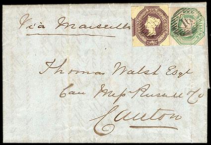 Great Britain, 1847, Queen Victoria (embossed), 1s pale green. With light file fold, in combination with 1854, 6d red violet (7), canceled with barred numeral "19" in diamond on cover from London to Canton, China; endorsed "Via Marseille" at upper left, backstamped London "Maltese Cross 10 Oc, 1856" origin datestamp with docketing acknowledging receipt on Dec 1, 1856, Very Fine, a very rare usage to China. SG No. 54. Scott No. 5; Estimate $500 - 750. US$500-750 (Image)