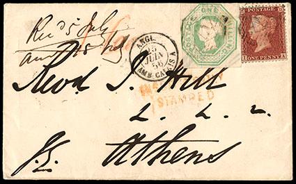 Great Britain, 1847, Queen Victoria (embossed), 1s pale green. In combination with 1855, 1d red brown perf 16 (14), tied on 1855 cover from London to Athens with barred numeral "17" in diamond; "Calais 23 Jun, 1856" transit cds and red "insufficiently stamped" cancels on front, backstamped with light Athens receiving cds, Extremely Fine, a very scarce cover to a rare destination. SG No. 54. Scott No. 5; Estimate $500 - 750. US$500-750 (Image)