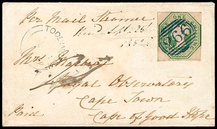 Great Britain, 1847, Queen Victoria (embossed), 1s pale green. Square cut, close at right and just touching at top, on cover from Dunstable to Cape Town, cancelled with blue barred numeral "266", endorsed "Per Mail Steamer" at top, Toddington transit cds on front, backstamped blue "Dunstable Au 13, 1852", Extremely Fine, a scarce cover in excellent condition to this difficult destination, with 1997 B.P.A. certificate. SG No. 54. Scott No. 5; Estimate $500 - 750. US$500-750 (Image)