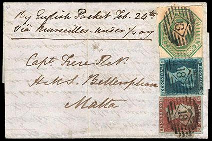 Great Britain, 1847, Queen Victoria (embossed), 1s pale green. In combination with 1841, 1d red brown, 2d blue (3, 4) all with four margins, tied on 1854 cover from London to Malta with barred numeral "18" in diamond, Extremely Fine, a lovely three color franking cover. SG No. 54. Scott No. 5; Estimate $500 - 750. US$500-750 (Image)