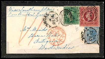 New South Wales, 1862, Queen Victoria, 1s rose carmine, perf 13. In combination with 1862, 3d deep green, perf 10 and 1863, 2d blue, perf 13 (37, 48) on 1870 mourning cover from Sydney to Antigua, West Indies with "Sydney De 30, 70" duplex; endorsed "Via Southampton" at upper left, red "London Paid" transit, backstamped with traces of an Antigua cds, one backflap missing, Very Fine, a very rare usage to Antigua, signed Holcombe. SG No. 168. Scott No. 42; Estimate $500 - 750. US$500-750 (Image)