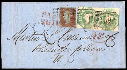 Great Britain, 1847, Queen Victoria (embossed), 1s pale green. Horizontal pair in combination with 1841, 1d red brown (3), tied on 1851 cover from Glasgow to Philadelphia with Barred Numeral "159"; Glasgow thimble cancel at left also tied with scarce red "New York British Packet 48 Mar 28" cds, and "Paid Ship" cancel, "42" cents rate mark below, backstamped with boxed "Glasgow Mar 7, 1851" datestamp, Extremely Fine, a very attractive and scarce cover with excellent eye appeal. SG No. 54. Scott No. 5; Estimate $500 - 750. US$500-750 (Image)