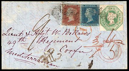 Great Britain, 1847, Queen Victoria (embossed), 1s pale green. In combination with 1841, 1d red brown, 2d blue (3, 4), tied on 1852 folded cover with indistinct cancels from Mulbarton to Corfu; addressed to "Lieut & Adjt W. Bellairs, 49th Regiment, Corfu", red Mulbarton handstamp on front, backstamped "Trieste 15 7" double ring cds and "Corfu 17 Aug" receiving datestamp, Very Fine and choice. SG No. 54. Scott No. 5; Estimate $500 - 750.