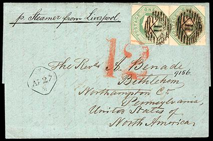 Great Britain, 1847, Queen Victoria (embossed), 1s pale green. Two singles, canceled with barred numeral "11" in diamond and tied with large numeral "12" on 1848 cover from London to the US: endorsed "p.Steamer from Liverpool", Extremely Fine. SG No. 54. Scott No. 5; Estimate $400 - 600. US$400-600 (Image)