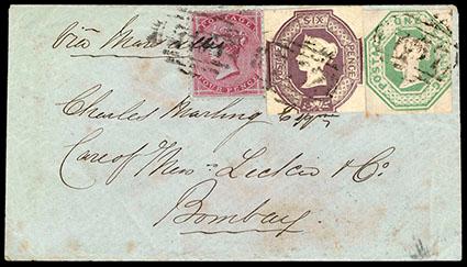 Great Britain, 1847, Queen Victoria (embossed), 1s pale green. In combination with 1854, 6d deep purple and 1855, 4d rose on bluish paper (7, 22), all tied on 1856 cover to Bombay with indistinct barred numeral; endorsed "Via Marseilles" at upper left, backstamped with "Bombay Fe 15, 1856" receiving cds, Very Fine, a rare franking with two different embossed issues to India. SG No. 54. Scott No. 5; Estimate $400 - 600. US$400-600 (Image)