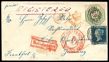 Great Britain, 1847, Queen Victoria (embossed), 1s pale green. In combination with 1855, 2d blue on bluish paper, perf 16 (10), tied on 1855 registered cover from Windsor to Bischofshein, Germany with barred numeral "890"; various red cancels on front including "Crown Registered" and boxed "Reccomandirt" cancels in red, backstamped with blue "Windsor Mr 19, 55" cds and boxed "Bischofshein" receiving datestamp, Very Fine, a scarce and colorful franking. SG No. 54. Scott No. 5; Estimate $300 - 400. US$300-400 (Image)