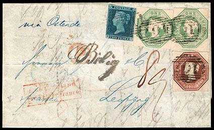 Great Britain, 1848, Queen Victoria (embossed), 10d brown. (horiz. file fold) in combination with 1841, 2d blue, "white lines" and 1847, 1s green (3, 5), tied on 1849 cover from Bradford to Leipzig with barred numeral "10"; endorsed "via Ostende" at upper left, backstamped with blue "Brandford Oc 10, 1849" origin datestamp and German receiving cds, Extremely Fine, a scarce and appealing three color franking. SG No. 57. Scott No. 6; Estimate $500 - 750. US$500-750 (Image)
