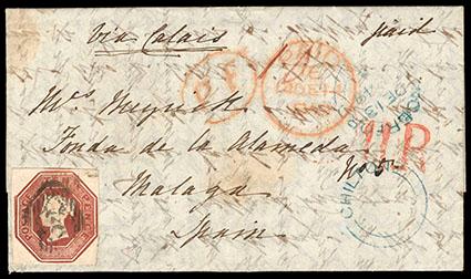 Great Britain, 1848, Queen Victoria (embossed), 10d brown. Four margin single canceled with indistinct barred numeral on 1849 folded letter from Chilton to Malaga, Spain; blue "Chilton" cancel at left, red "11R" rate marking just above, backstamped with "Malaga" cds, Very Fine and choice, a scarce 10d usage to Spain. SG No. 57. Scott No. 6; Estimate $500 - 750. US$500-750 (Image)