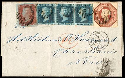 Great Britain, 1848, Queen Victoria (embossed), 10d brown. In combination with 1841, 1d red brown margin single and 2d blue strip of three (3, 4), light folding crease affecting left stamp of strip, canceled with barred numeral "12" in diamond on cover from London to Christiania, Norway; Calais transit cds on front, backstamped with Hamburg transit cds, Very Fine and choice, a rare three color franking to Norway. SG No. 57. Scott No. 6; Estimate $500 - 750. US$500-750 (Image)
