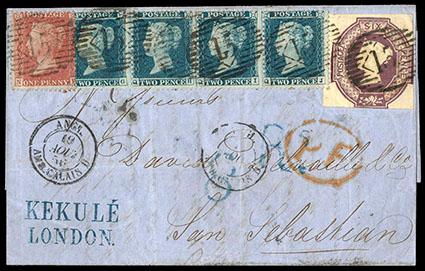 Great Britain, 1854, Queen Victoria (embossed), 6d purple.in combination with 1854, 1d red brown and 2d blue perf 14 strip of 4 (20, 29), tied on 1856 folded letter from London to San Sebastian, Spain with barred numeral "15" in diamond; "Calais 19 Aug, 56" transit cds on front, backstamped with "San Sebastian 21 Aug, 56" receiving cds, Extremely Fine, a very rare cover. SG No. 60. Scott No. 7; Estimate $750 - 1,000.
